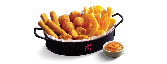 Mixed Starter Platter is a delicious starter with crispy chicken cubes, cheese sticks, cheddar potatoes and five-spice chunky potatoes.